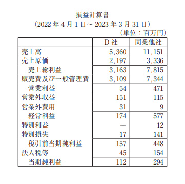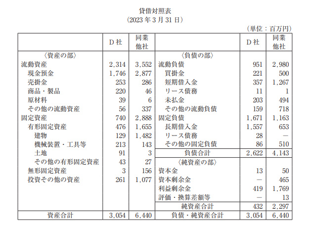 D社および同業他社の財務諸表は以下のとおりである。