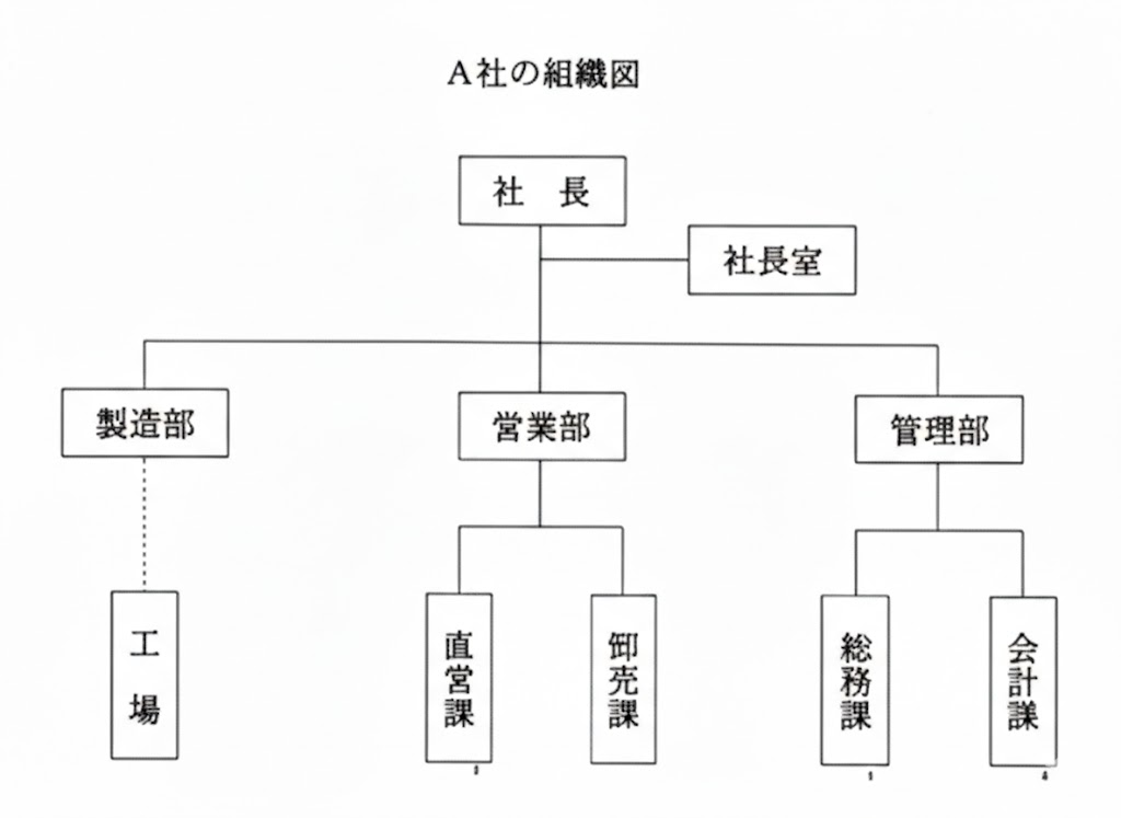 A社は、パンおよび菓子の製造・販売企業である。従業員数は臨時社員を含めて250名、売上高は約52億円である。典型的な同族企業であり、一部を除いて、株式のほとんどを創業者一族が所有している。生産は本社社屋内の工場で行っており、直営店5店舗での販売と、一般小売店、スーパーやコンビニエンス・ストアなど量販店への卸売販売を行っている。A社では、多くの中小企業と同様に、基本的に製造部、営業部、管理部の3部門を中心とした機能別組織(職能別組織)を採用している。